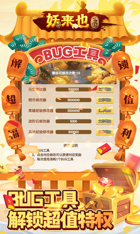 《妖来也(BUG修改器刷充)》是一款三国卡牌手游,经典6v6,体验各时代英雄集结的力量,统率三军征战四方,一统乱世!不必担心粮草,BUG修改器在手,天下我有,随时随地自由修改游戏数值,科技的力量已经无所不能啦!快来跟三国猛将一起体验吧!