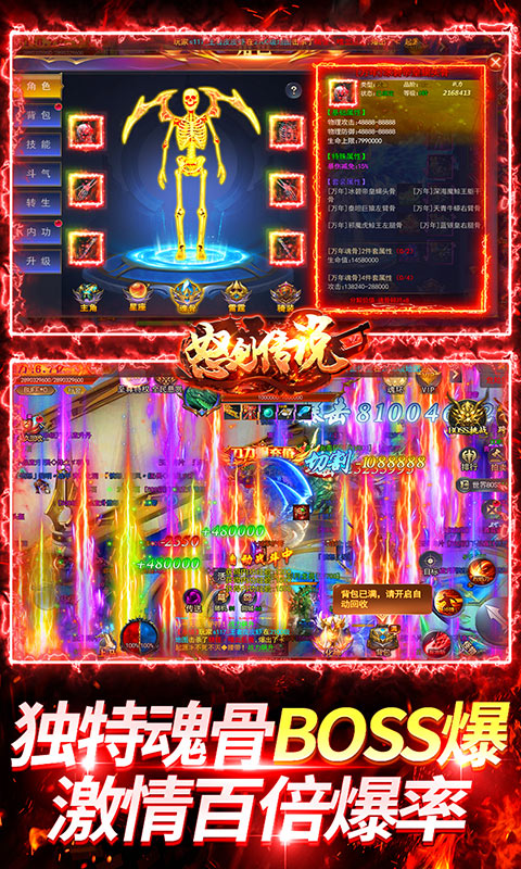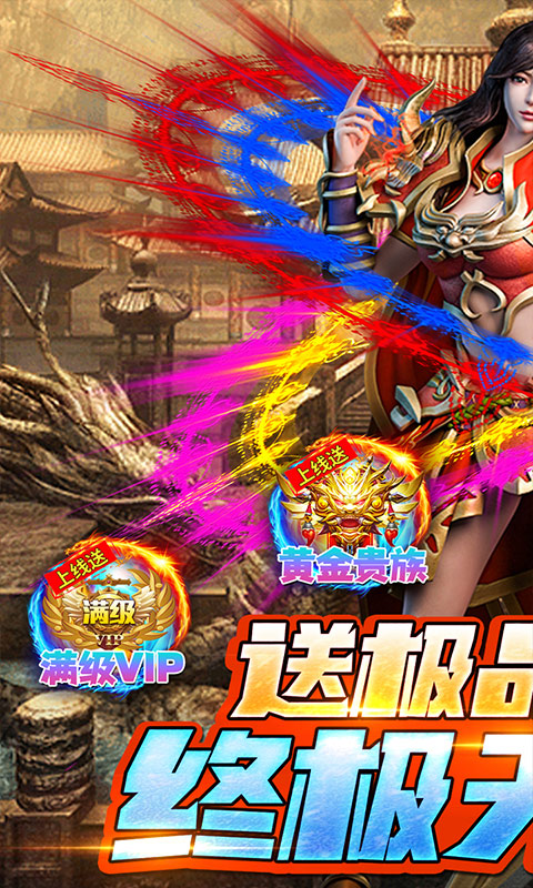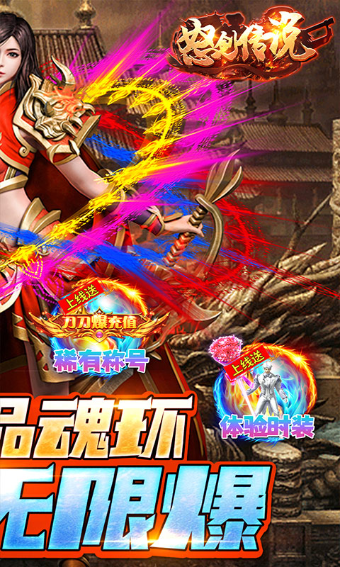 《怒剑传说(终极无限爆)》上线送满级VIP、黄金贵族、28888福利金钻、100万钻石、限定称号、限时体验时装、实物盲盒。送十年魂环,属性提升爆率狂飙。上线极致攻速体验,最高可提升200%攻速。激情百倍爆率,全新魂环超变。独特魂骨BOSS爆,套装属性很诱人。