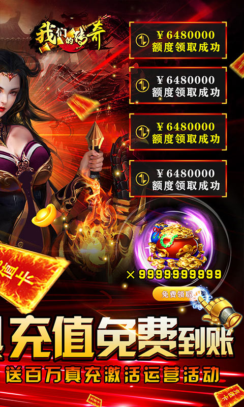 《我们的传奇(全免破解直充)》是一款全新单职业挂机H5传奇动作手游!内置破解刷充工具,挂机即能获得充值余额,可代替RMB进行充值!每天在线都送无限点充648!首冲!累充!vip!统统免费激活!各种玩法掉落充值币,现金券,每天都能获得几十万充值!各种福利礼包、高级高级道具,各种幻化成堆掉落!战法道三大职业风格迥异,技能酷炫秀翻天!快来征战你的传奇之路吧!