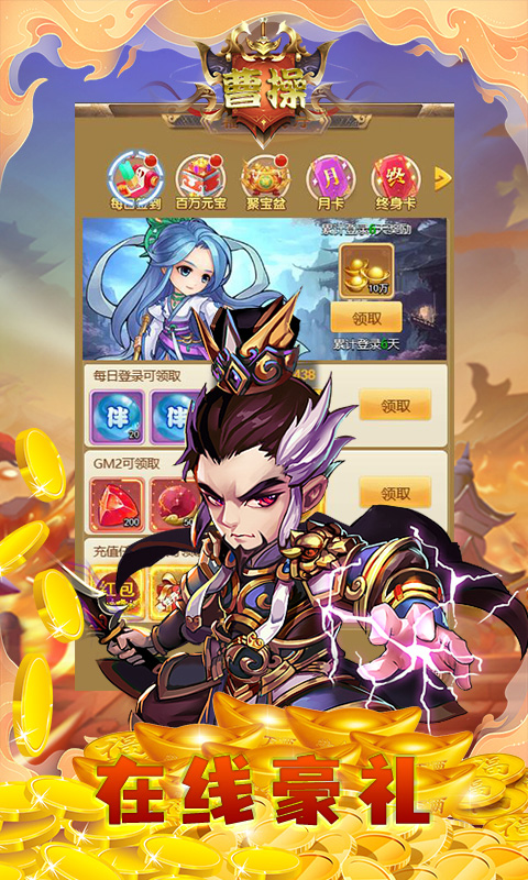 ★后缀说明:上线福利:vip20,66万元宝,648红包*1,168000金条,曹操*1,SSSSR武将礼包