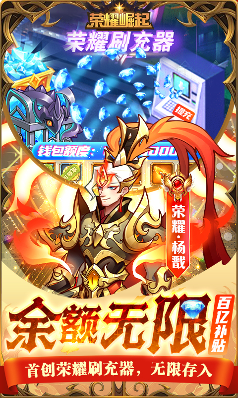 ★【创角福利】创角即送荣耀刷充器,余额无限存入,5星圣骑士开局,再送100元提款余额、满级VIP30、钻石*88888、金币*588888、经验水晶*588888