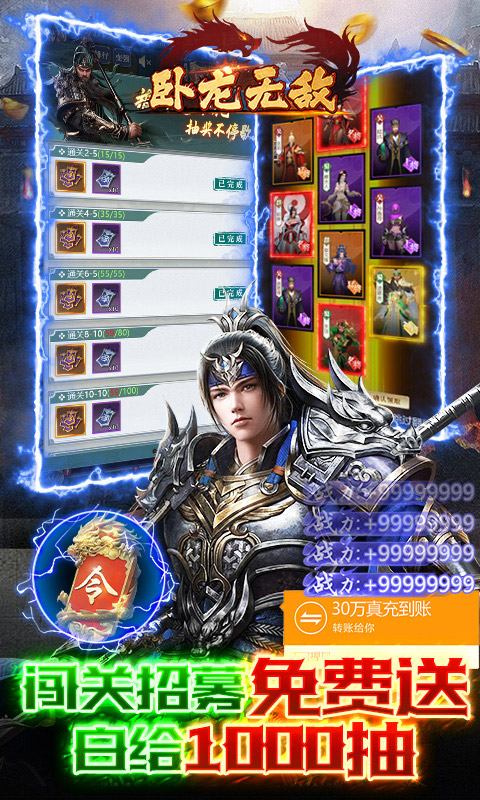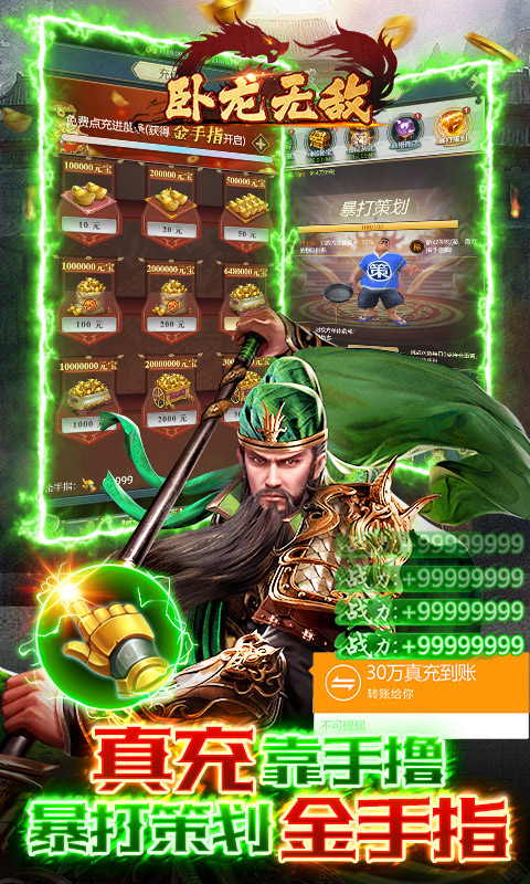 《卧龙无敌(GM刷充金手指)》是一款极具策略性的放置卡牌游戏,单身10年策划,真人还原入驻,为手速党精心策划5秒真男人福利玩法!暴打策划获得金手指道具,免费充值点到手软!闯关,挂机均可获得大量充值卡碎片,不花钱免费合成千元真充卡!多日累充!每日累充!VIP!统统免费激活,活动免费白嫖!游戏还原经典三国场景以及数十个史诗级武将收集,全方位自由培养,阵容搭配千变万化,合击技酷炫炸裂,十八般神兵齐出制胜全场,助力主公称霸天下,一统三国!新奇与经典完美融合,延续魏蜀吴群的传奇对决!