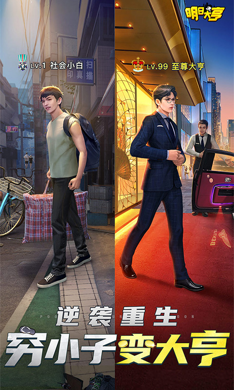 逆袭重生,穷小子变大亨!2022年度现代都市模拟创业手游《明日大亨》正式开启!《明日大亨》是一款现代商战题材的模拟经营手游,讲述一穷二白的打工人来到梦想岛,接受财富联盟资助,经过重重努力,坐拥豪车美女,逆袭大富豪的励志故事。游戏的开局,你将扮演身无分文却拥有超强商业思维的打工人,被财富联盟选中投资,从无到有经营店铺、创立公司,培养员工人才、经历各种商业考验,最终成为豪车美女随心选,登顶富豪榜的人生赢家!