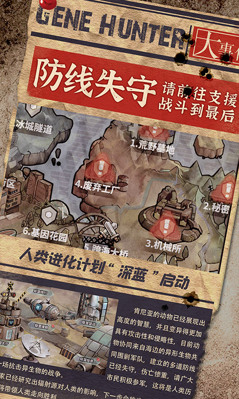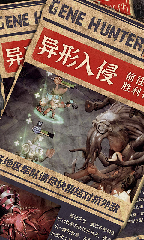 《基因猎人》是一款末世废土风格浓厚的放置卡牌游戏,搞怪的画风,炫酷的技能科技,烧脑的剧情,爆笑连连的幽默短剧,多元化的流派搭配策略,带你体验不一样的冒险旅途!在这里,你能解锁到各种各样的历史英雄,明星大腕等等,赵云VS爱因斯坦,电锯手艾琳VS霍金,卓别林VS川普。各种英雄大乱斗!只有想不到,没有做不到,快来召唤属于你自己的英雄吧!