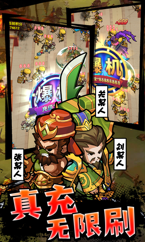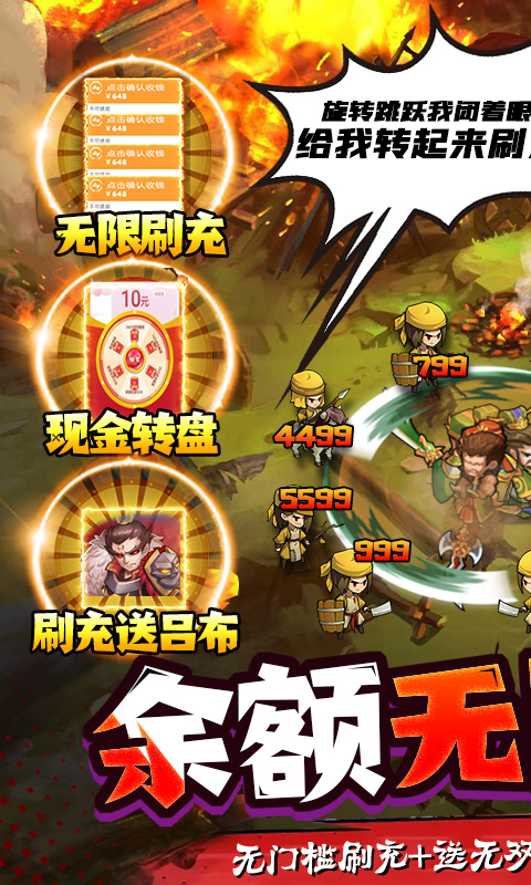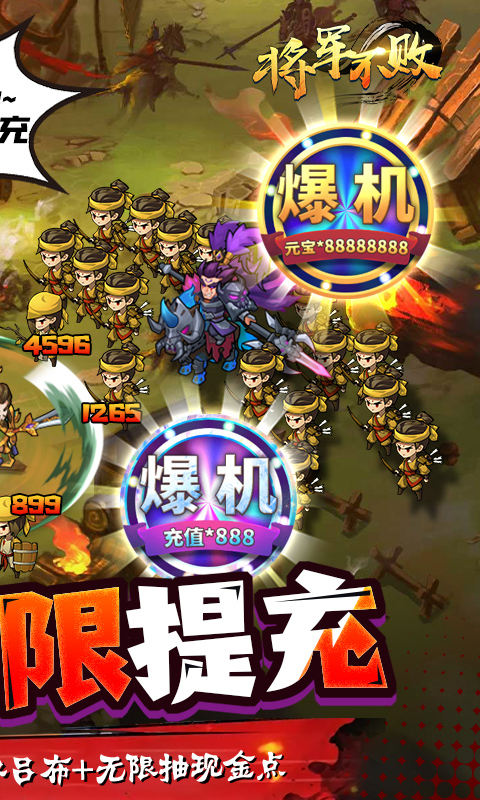《将军不败(余额无限提充删测)》是一款三国放置Q版回合制手游。上线参与三英战吕布的割草小游戏,直接拿上千充值,能激活首充等各种累充活动~且每天有三次参与机会,一个靠割草游戏白嫖充值的玩法,规定时间内割草越多,获得的奖励越多,除了充值场还有元宝铜钱场,可以拿上亿元宝还有千万铜钱,直接爽到飞起,白嫖的充值获得还可以拿到神将吕布,闯关直接无压力。游戏通过培养武将实力,习得高级武将技能,游戏中不管你做什么都有道理,因为真正的热血的三国就是等你来成王!?