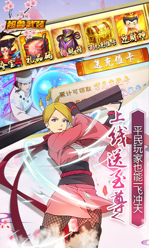 《超兽武装(GM零氪刷充)》以火影忍者为游戏背景,玩家出生在木叶村,继承火之意志,保护村子,与各路忍者展开激战,组建属于自己的小队,带着伙伴砥砺前行,游戏玩法新奇,上线送至尊V,千万钻石,千万金币,登录千元真充卡,新手代币新玩法,免费开启特权商城,无限资源一经开启,资源豪礼无限领取,更多豪礼拿到手软,还等什么,快来继承火之意志吧,哪里斗!木叶飞舞之处,火亦生生不息。