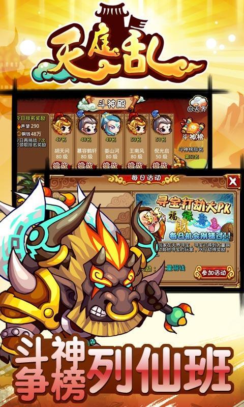 《天庭乱》以西游为背景的即时玄仙RPG手游大作。画面细腻,语聊发图;畅快的打击、幽默的剧情、多变的组合、激烈的族战、炫酷的坐骑。代入感极强,颠覆以往,带给你前所未有的游戏体验。