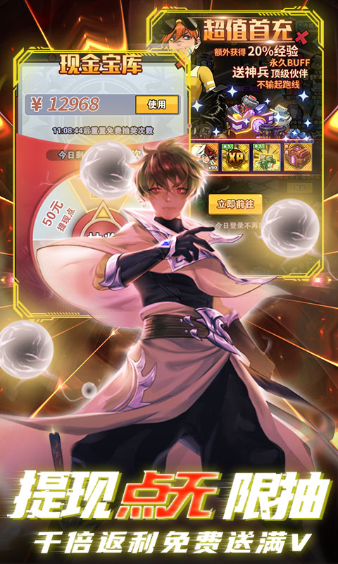 上线就送10亿元宝,登录在线还可抽取提现点,礼包直充买不停,不花钱也成神!打金永无止境,忍者手游巨作《侍忍者(提现点免充)》强势来袭,超清画质,特色系统,多样玩法,海量装备给你前所未有的刺激体验。击杀BOSS以及挂机无限掉直充卡,0氪畅玩不是梦!创角直升满V,天天送真充,直充特权免费拿!免费首充即送炫酷时装和超强BUFF,史诗装备等!还有全新活动,新增各种神级伙伴等着你!!