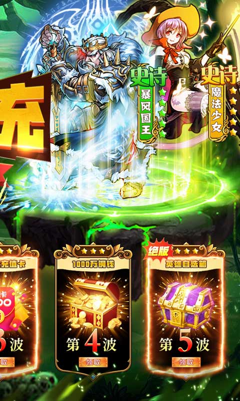 ★上线送GM1、钻石*888888、铜钱*1000万、1000元充值额度卡、英雄自选包*5、欧皇券*50、进阶石*5000、虚灵套装自选包*4