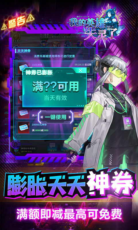 《我的英雄失灵了(天天神券折扣)》是一款新次元超级特工手游。轻松放置卡牌玩法,护肝不熬夜。百位超能特工供您征召,独创武装模块与芯片组件强化特工;AI战斗无人机协同,空地一体战斗。化解宇宙规则失灵危机,合纵连横对抗敌对阵营。