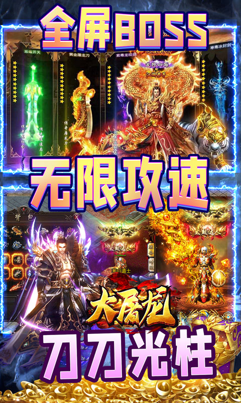 《大屠龙(跨年三国爆充)》是一款精心制作的单职业超变传奇手游,上线做任务免费送VIP,大量VIP礼包等你拿,打怪就爆积分卡,无限充值免费爆,打怪爆货币。超高爆率,刀刀光柱,散人称王,2022最爽超变版本!大屠龙伴你跨年爽翻天!