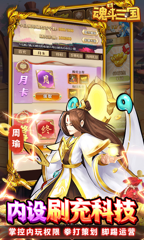 《魂斗三国(送毕业关羽刷充)》本游戏是一款以三国为题材的放置挂机类卡牌手游,创角送满V,还有全新的刷充功能,免费激活首充、月卡、特权、礼包,还有毕业关羽免费领取!乱世当道,当招募将领,平定乱世,称霸当世,不负三国。游戏里总共设置了众多蜀魏吴三国名将,可搭配组合,环环相扣,玩法多样,好玩不腻,挂机收益,轻松护肝。玩家可身临三国战场,招关羽过关斩将,募赵云勇闯长坂坡!