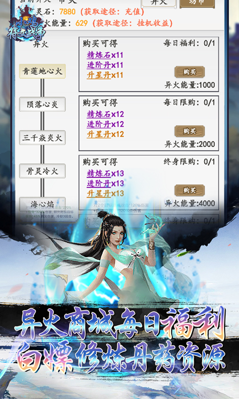 ★后缀说明:在主页面点击“异火降世”即可进入异火玩法;每个玩家都可以免费激活初级异火特权“青莲地心火”,功能激活后,在挂机中可以获得异火能量去兑换真充卡,使用真充卡可获得“仙缘”货币,激活VIP经验和累充奖励;每天0时重置异火能量获取上限,即异火降世无限充。