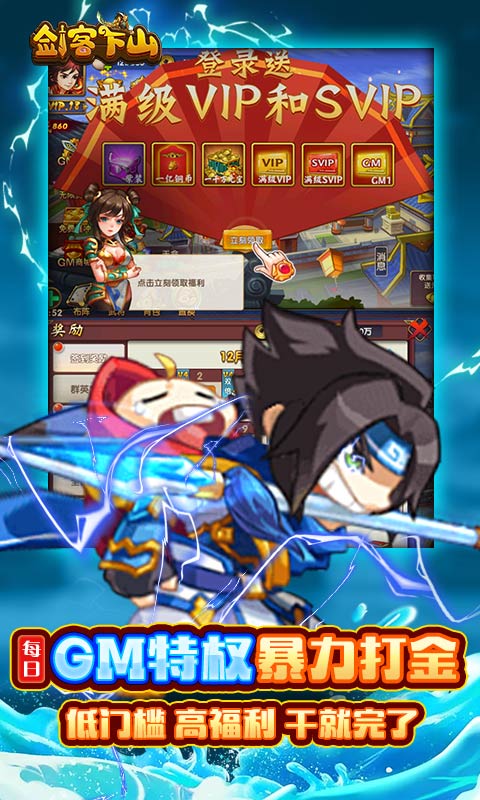 《剑客下山(GM无限打万金)》是一款三国题材的策略卡牌游戏!!!精美的人物制作,超多有趣的游戏玩法,三国群英与神魔交汇,群魔乱舞;通关关卡刷装备,手指点点获得海量资源;这个版本氪金再也不是门槛,GM特权,直接刷新三观,拿不完的打金卡,天天满满当当的补贴福利;GM商城极品直接拉满不犹豫;无限资源,元宝在手,天下任我行!!!