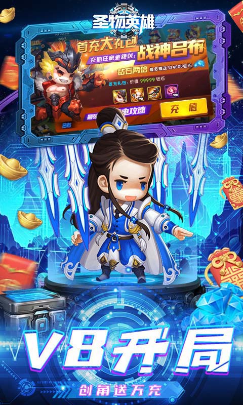 超时空战逗手游《圣物英雄(刷充毕业神将)》汇聚全球最热门最受欢迎的英雄100%还原了英雄们的招牌特技!不再是传统的回合制战斗,手指轻点立即释放超炫华丽的超强大招,粒子级特效震撼眼球!独创进击的首领等超多精彩玩法,诸葛亮橙装豪礼上线就拿、vip直升任你体验,选择您最喜爱的英雄,加入到拯救世界的行列中吧!