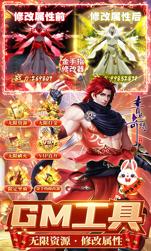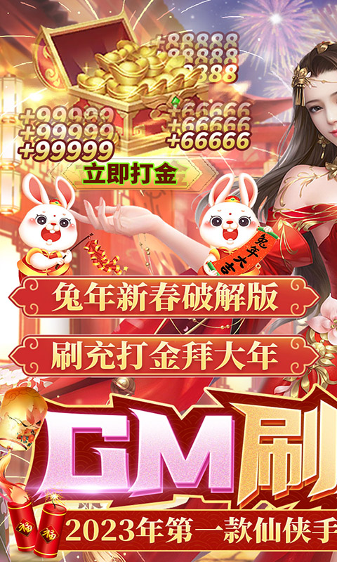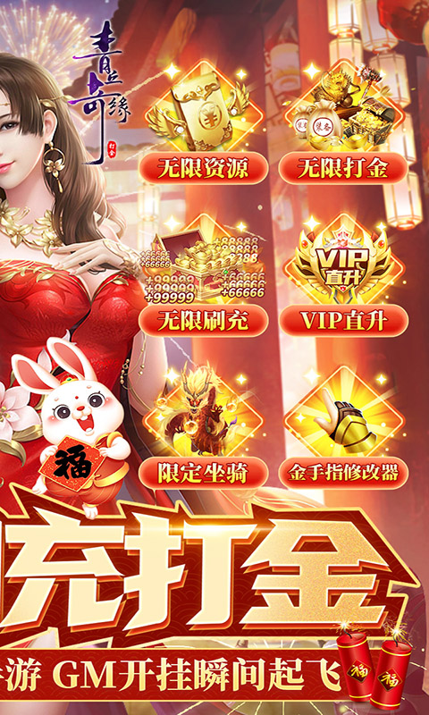 《青丘奇缘(GM刷充打金)》【兔年新春特别版】,GM破解运营活动、各种外观道具、双人坐骑,福利全面提升,诚意满满贺新春,上线即领兔年注册壕礼,体验GM开挂瞬间起飞的快感!过年不花钱,一年辛苦积蓄攒起来,还能在游戏里面打金赚钱,刷怪爆真充,《青丘奇缘(GM刷充打金)》【兔年新春特别版】为全体仙友拜年送大礼,福利红点点不完,各种奖励领到手软!