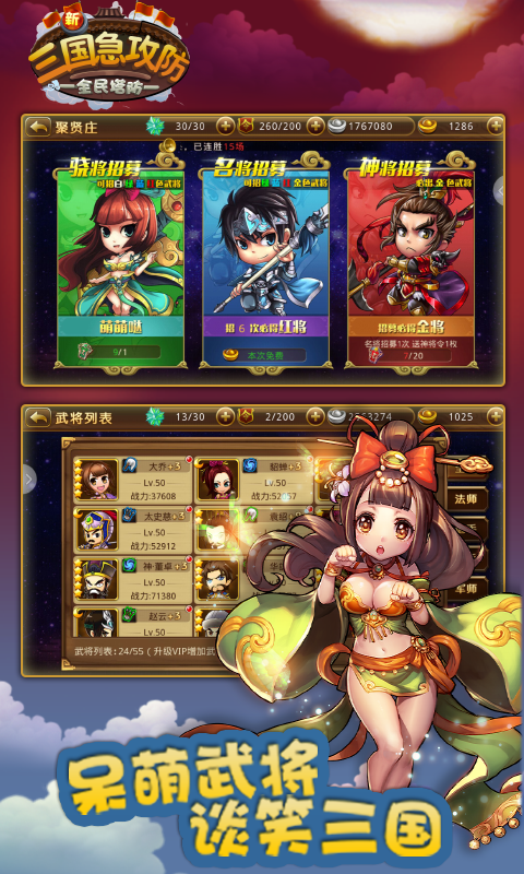 《三国急攻防(塔防无限送真充)》是一款萌系塔防手游,将三国历史上叱咤风云的人物,变化为一座座有爱的防御塔。游戏结合了策略、培养、战斗,每个武将也都各具特色,玩家在塔防战斗的过程中可以充分发挥每一个武将的特点,让自己的武将发挥莫大的作用。Q版的设计风格也让每一个武将都更加的亲切可爱,让玩家感受不同的三国人物!