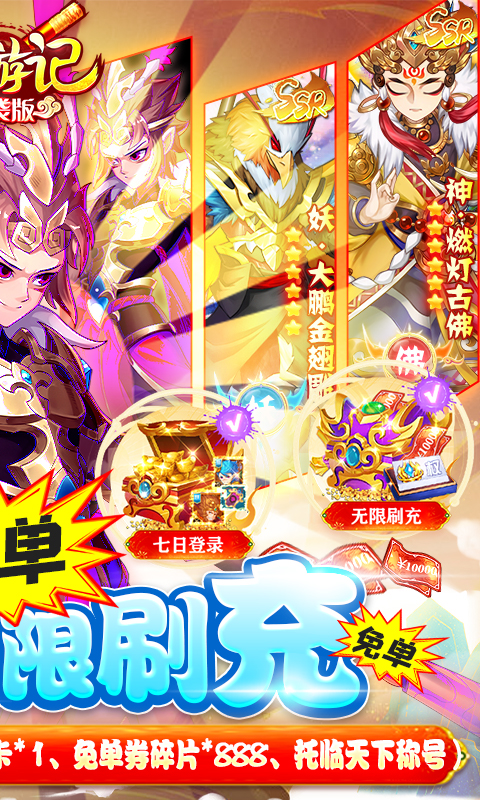 ★【七日登录】送加强自选奖励宝箱、自选神魔输出礼盒、免单券、神将【黑悟空】。