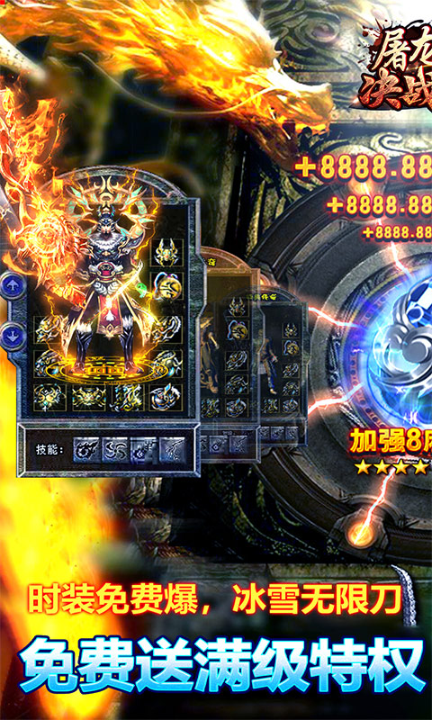 《屠龙决战沙城(0元送顶赞)》上线送满VIP,满级超级特权,限时·烈焰屠龙*1,绑定元宝200万,海量珍稀特权0元享受,开局满攻速,真无限刀,所有地图无限制,想进就进,特色狂暴系统,打怪爆率秒升100%,满屏光柱,装备全靠打,小怪爆终极,游戏内所有装备保值,高阶神装回收、进阶、融合、交易,全自由支配,特色时装boss,各种炫酷时装幻武免费爆,特色幸运增幅,抗吸血,破复活,砍人必备,圣器系统,珍稀属性免费升级,永久加成,跨服攻沙决一雌雄,鸡王争霸谁与争锋