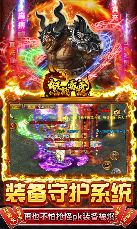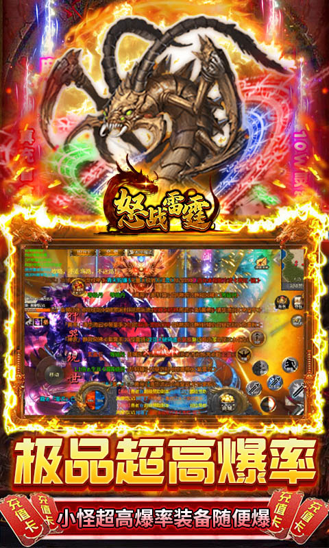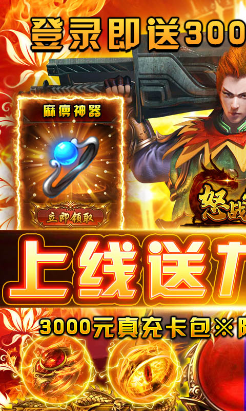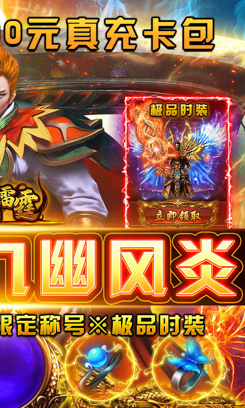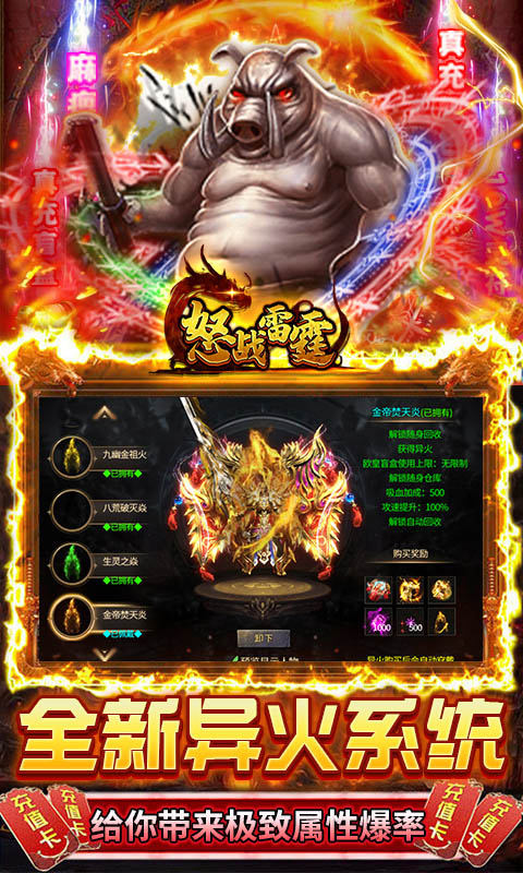 《怒战雷霆(异火无限刷充)》上线送3000真充卡礼包,100W元宝,九幽风炎特权,创号免费领取,炫酷异火外显,上线自带经验泡点,一秒999刀,无限攻速,千倍爆率,所有装备和特殊装备、魂环以及升级材料游戏内全部可爆,极品吸血,刀刀暴击,特色狂暴系统上线就送,刀刀切割满屏爆光柱,装备全靠打,小怪爆终极武器!!!