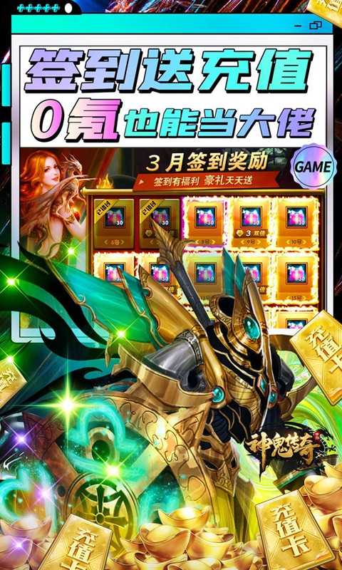 《神鬼传奇(天天送千充)》是一款大型3D仙魔风格MMO手游。精致的美术画面通过炫酷3D效果为玩家呈现了一个人魔大战的历史战场。绚丽坐骑、特色宠物、逆天神器、极品装备、超级BOSS、征途历练等玩法供玩家探索,踏上君王之路。全自由化的PK对抗,极致激爽的战斗对决,将最大限度满足你对仙魔手游的所有幻想!