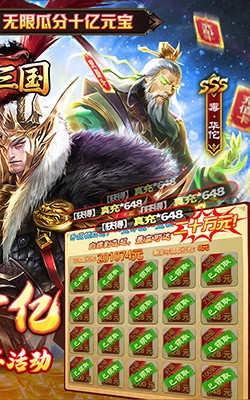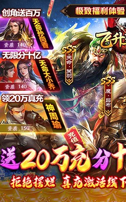 《战吕布(送20万充分十亿)》经典三国携超强福利震撼回归,超高福利超爽战斗倍速,让你拥有不一样的游戏体验。升级领20万元真充,真充卡可激活线下永久累充活动,并且可以解锁全部GM商城!独创新玩法超级宝藏,免费瓜分百亿元宝,奖池不间断,无限瓜分百亿元宝!登录签到免费领取海量道具,领到最后应有尽有!玩家在游戏中化身为主公,招兵买马带领众多名将征战四方结交天下英雄,还有机会与当世美人结缘,一统天下功成名就。完美还原了三国战争场景,权谋战略之间的较量,风起云涌,号角吹响,率领大军参与国战,攻城略地,在战乱中建立自己的势力,定天下以安民心。