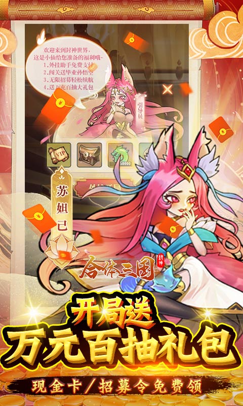 全新卡牌策略手游《合体三国(免费无限万充)》携重磅福利强势来袭!开局解锁VIP10,还有5万仙玉,万充百抽礼包,让你直接赢在起跑线上。来玩就送金仙孙悟空,推图还有现金卡和珍稀资源拿到手软。每天登录轻松领福利,白给无限万充,让你不花钱也能当氪金大佬!更有顶级神将、装备、仙友等你来解锁。在这里,让你体验不一样的玩法,超绚丽的技能,配合各具特色的英雄大招、角色羁绊得合体神技以及灵活自由的战斗策略,让玩家在战斗中创造出无限可能!体验不一样的游戏乐趣!