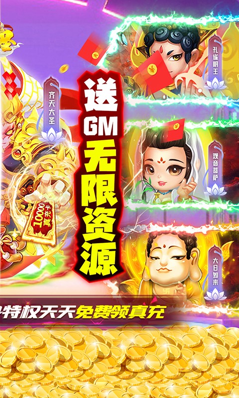 ★创角就送万元真充卡,每日在线送2000元GM充值,可免费激活首充礼包,获得强力紫金将[孙悟空]。