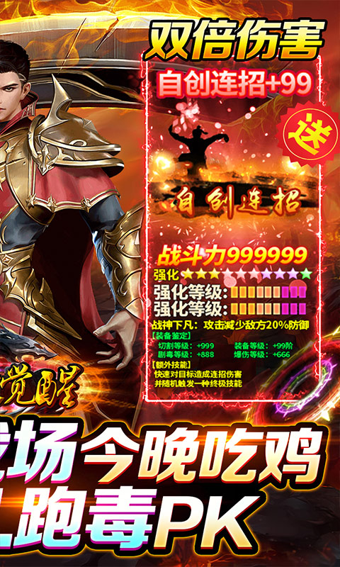 《龙之觉醒(吃鸡战场版)》上线送满级VIP、30W绑定蓝钻、限定称号“自创连招”、灵宠-黑白熊猫、小丑体验时装、透视特戒。独创光速双刀系统,双倍伤害,自创连招技能自由组合,争做PK王者!七天登录送豪礼,首天送战神铠甲时装,打怪可成长属性!双倍点券系统,点券可代替现金充值!自由打宝全凭运气!跨服吃鸡战场新玩法,跑毒PK,大吉大利,今晚吃鸡!