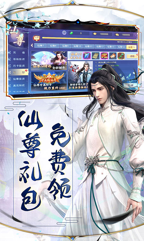★上线福利:仙尊15级、元宝*1888888、绑定元宝*1888888、GM礼包*1