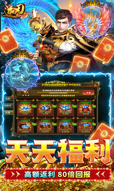 ★上线福利:刀刀切割只只高爆(称号)*1,紫钻会员1,VIP20,钻石*20万,元宝*1010万,10元充值卡*1,10元充值券*1