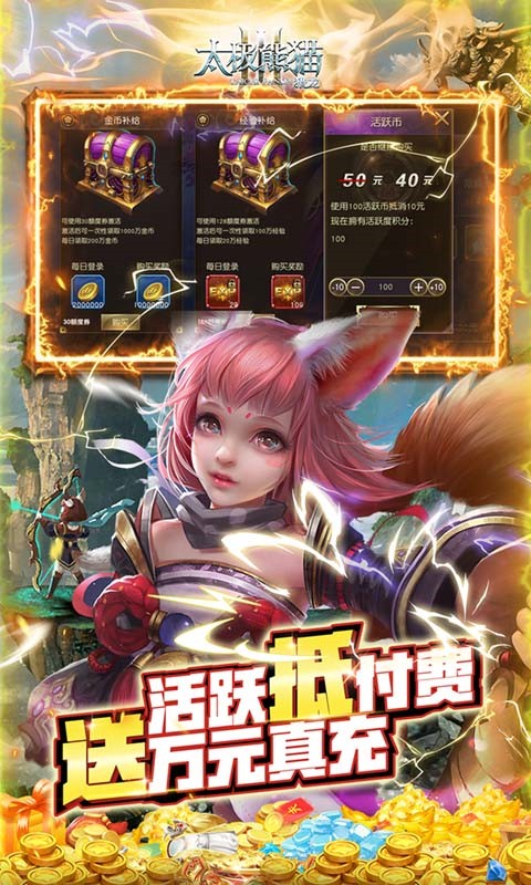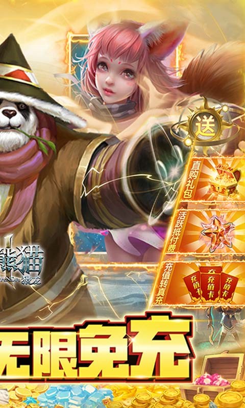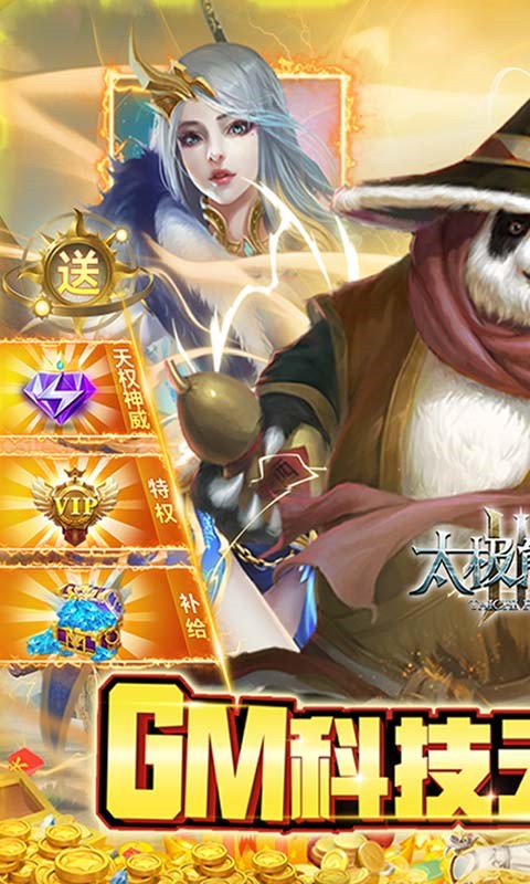 《太极熊猫3:猎龙(GM科技无限免充)》是一款以激爽战斗为核心的3D魔幻ARPG手游。福利大幅提升,VIP23,“刷无限免充”称号,额度券*500,钻石*258888,绑钻*288888,紫色兑换券*1000,金币*2000W,小飞鞋*9999!三大特权震撼来袭,天天再送真充卡!让你玩到爱不释手!游戏不仅拥有超高清画质,并传承了当下最正统的、最受欢迎的游戏玩法元素,却又融合了新创的平衡数值养成,大量新增副本,经典坐骑,激萌宠物。天神让你的战力起飞!全新魔幻世界,多样跨服竞技,瑰丽3D视觉特效,上乘的游戏品质,酷炫的游戏场景,多种陆空坐骑任你捕捉。战场跨服战,战个痛快。自动主线,解放双手。
