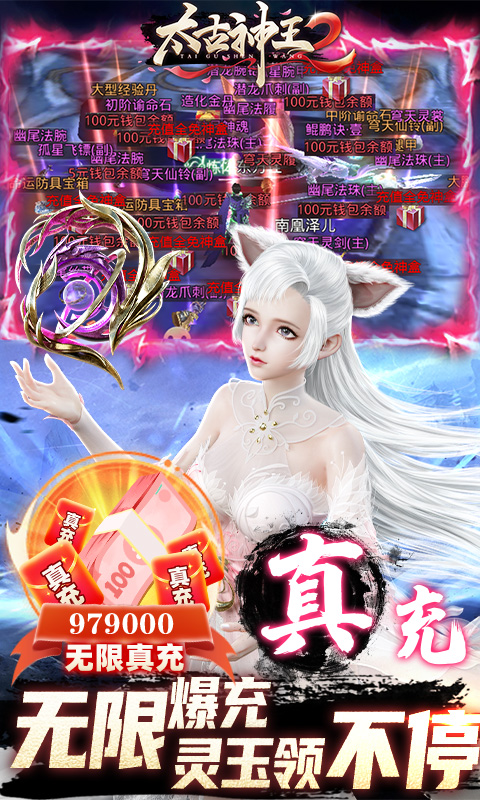 ★创角解锁海量内部福利,打金效率100%,太古炫酷时装包,万元真充卡礼盒,500元真充卡,500钱包余额,100000000金币,豪礼立享;