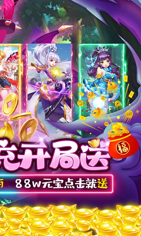 ★创角即送:貂蝉*1,福利称号*1,元宝*88W,银两*1000W,1元真充卡*1000,祥云瑞兽(30分钟)*1,金械光翼(30分钟)*1