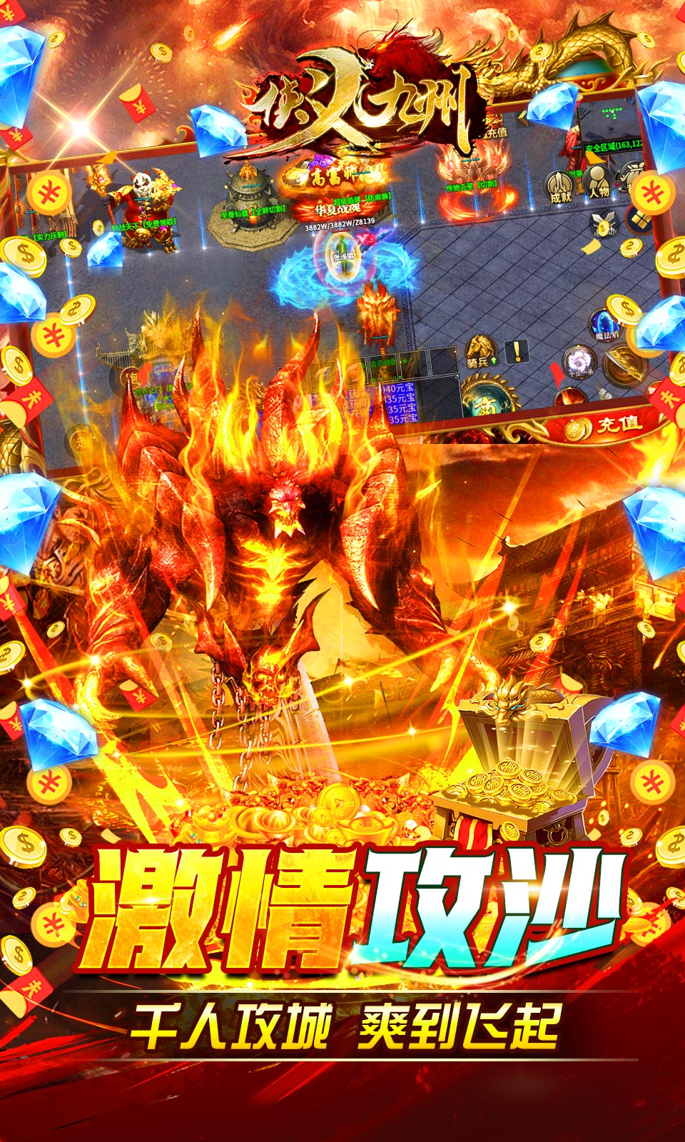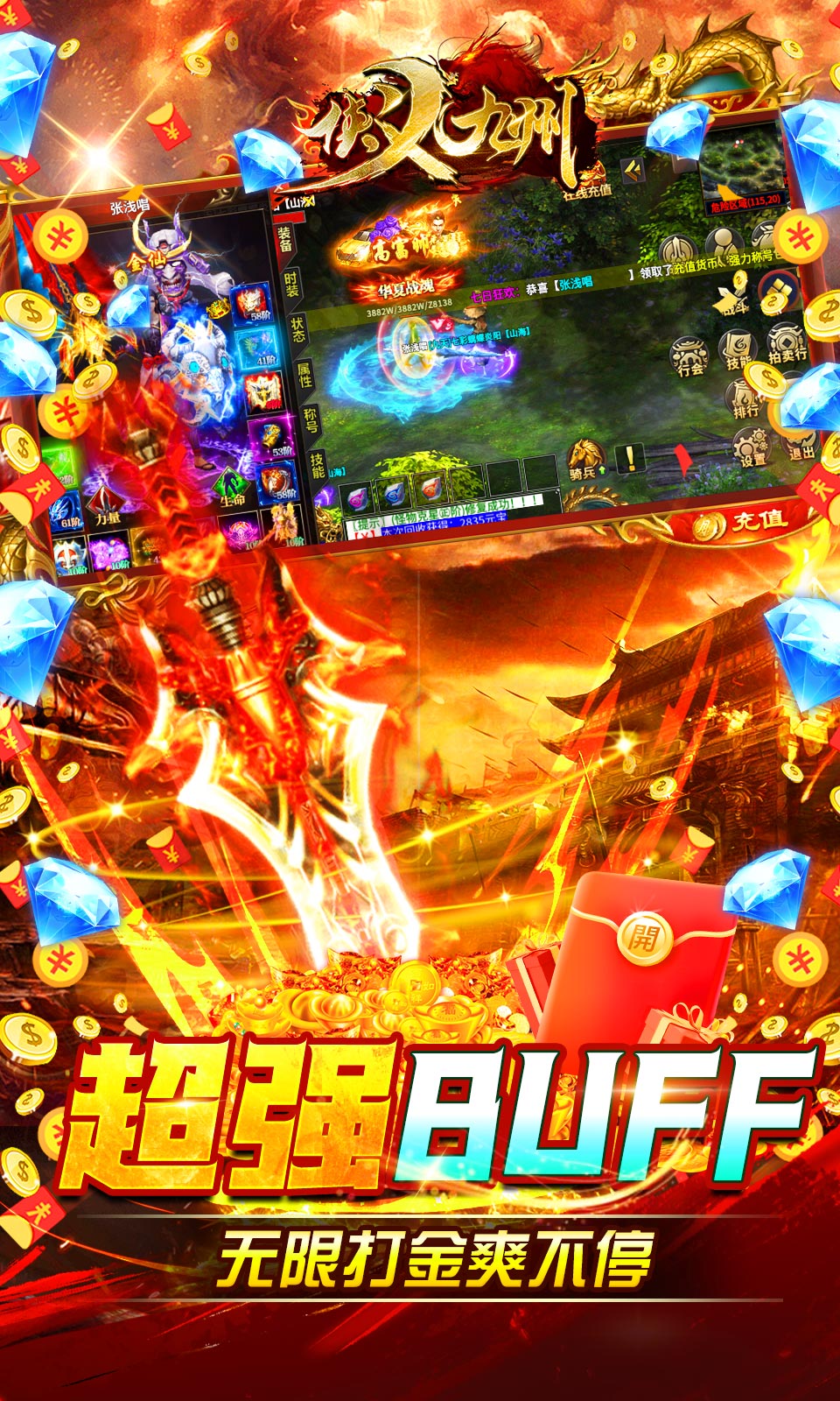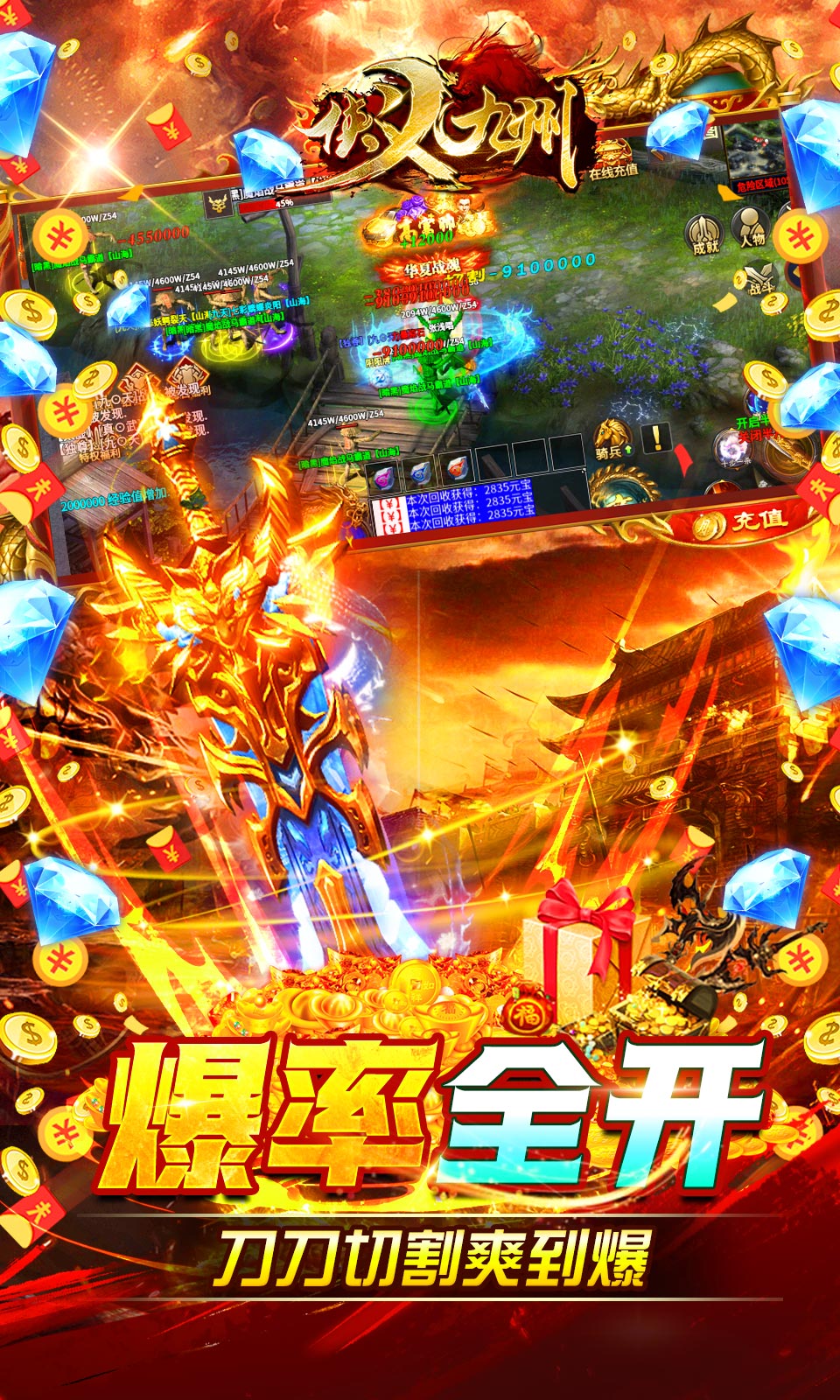 ★上线赠送10W切割卷,华夏战魂(称号),50万元宝,开天斩*1,自动捡取