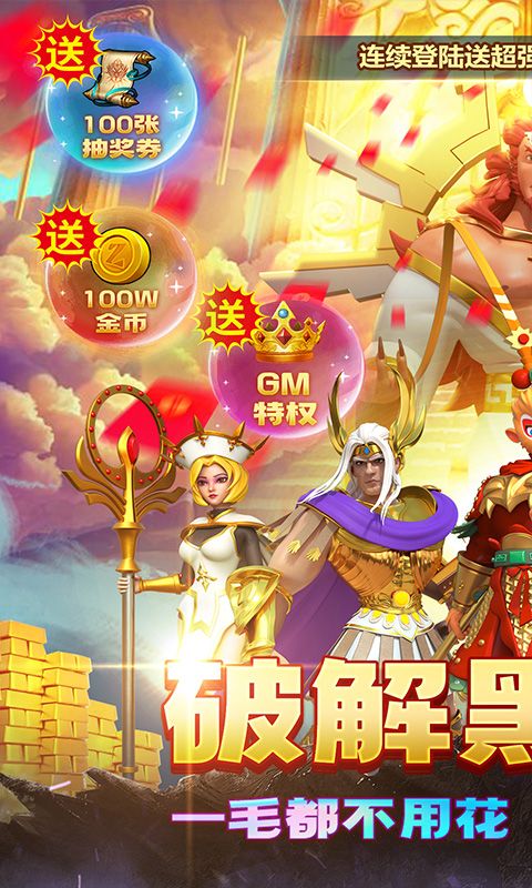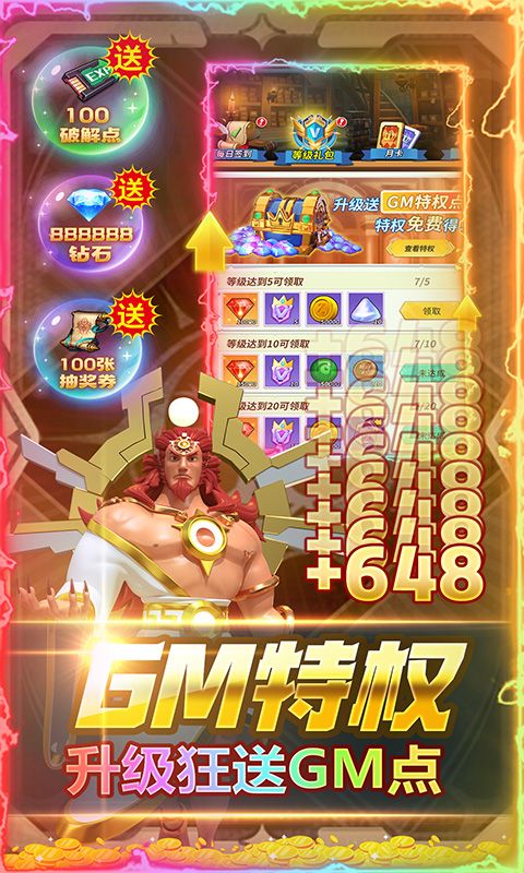 ★登录就送GM特权、100抽奖券宝箱,100破解点,100万金币,888888钻石!