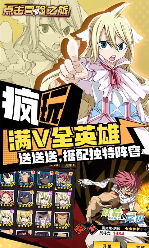 《点击冒险之旅(翻倍GM爽充)》一款以《妖精的尾巴》为主要题材的卡牌游戏,上线直接送满V,全英雄礼包,GM修改器。研发数年匠心打造,献给玩家一款高品质有策略的卡牌手游。 高度还原动画的经典情节。纳兹、露西、艾露莎等众多人气角色悉数登场,一起重温那些热血沸腾的精彩瞬间! 游戏中加入了诠释魔法和灭龙奥义的技能,高度还原的公会元素和角色阵容系统、技能释放、阵容排布都影响着战斗结果,与值得信任的伙伴一起冒险,结识更多强力伙伴!