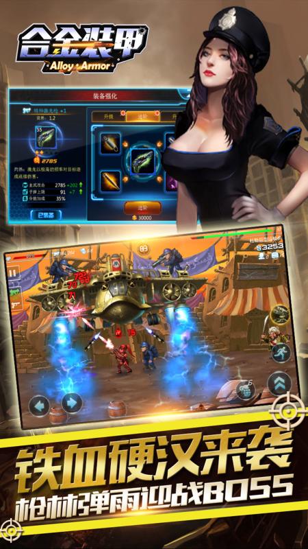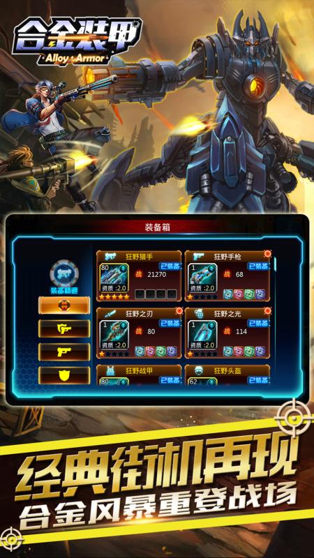 《合金装甲》是一款横版射击游戏。基于真实物理环境的子弹效果,打造最热血刺激的战斗体验!上千个风格各异的战斗场景,带你领略异域战场风景。拥有海陆空立体战斗模式,游戏还提供了不同战斗场合和多种武器类型:短枪、长枪、火箭炮、手雷、军刀;每类武器具有各自的攻击特点。旨在此还原真实战场环境。游戏中多样的角色养成路线,新颖的换装系统,给你独一无二的角色体验。