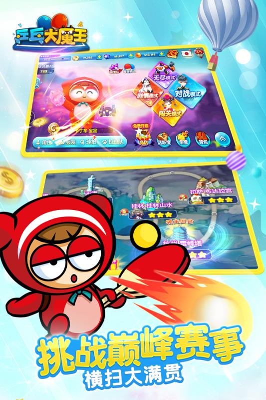 《乒乓大魔王》是韩国Bridea Smart公司开发的休闲体育类国民手游。该作品以中国“国球”乒乓球为核心玩法,具备实时对战的竞技性,兼具休闲操作的娱乐精神,游戏还适用中国玩家熟悉的休闲RPG成长模式并添加了剧情挑战、玩家PVP等玩法。游戏中的人物角色Q萌可爱、玩法轻松愉快是一款充满了欢乐和向上元素的国民级休闲体育手游!