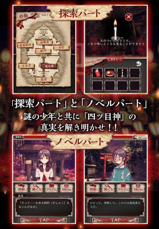 「“いらない子”は、四ツ目神(よつめがみ)につれていかれちゃうよ」 [ 謎解き×脱出ノベルゲーム ] --【 四ツ目神 】-- ▽▲▽『謎解き×脱出ノベルゲーム』とは?▽▲▽ 物語に重点を置いた長編脱出ゲーム(探索アドベンチャーゲーム)です。 プレイヤーは物語の謎を解くため、様々な人物から話しを聞いたり、キーとなるアイテムを探したりします。 時として、思いもよらぬ発言やアイテムが事件を紐解く鍵になることも…。 最後は自らの思考を頼りに、事件の真相を解き明かしましょう。 ▽▲▽----------------------------------▽▲▽ ▼『四ツ目神』の概要・特徴 ・脱出ゲームに長編シナリオを追加した新ジャンル『謎解き×脱出ノベルゲーム』 ・和風テイストのミステリー探索推理アドベンチャーゲームです。 ・シナリオボリュームは脱出ゲームの数十倍! なのに、最後まで無料で遊べます! ・操作はとっても簡単! 誰でも気軽に楽しくプレイできます。 ※この物語はフィクションです。実在する人物及び団体とは一切関係ありません。 ※このアプリは、シーン型オートセーブです。(一定のイベント毎に自動で記録されます) ▼『四ツ目神』はこのような方にオススメです。 ・ミステリー物の長編脱出ゲームで楽しみたい方 ・推理ゲームや脱出ゲーム・謎解きゲームが好きな方 ・和風テイストのゲームで遊びたい方 ・アドベンチャーゲームや物語(シナリオ)付きの脱出ゲームが好きな方 ▼サウンド提供 おとわび http://otowabi.com/ 甘茶の音楽工房 http://amachamusic.chagasi.com/ DOVA-SYMDROME http://dova-s.jp/ H/MIX http://www.hmix.net/ HURT RECORD http://www.hurtrecord.com/ MusicNote http://www.music-note.jp/ ポケットサウンド http://pocket-se.info/ 効果音ラボ http://soundeffect-lab.info/ げきばん! http://soundjewel.symphie.jp/product/gekiban/free/ 魔王魂 http://maoudamashii.jokersounds.com/ Music is VFR http://musicisvfr.com/ くらげ工匠 http://www.kurage-kosho.info/ 小森平の使い方 http://taira-komori.jpn.org/ びたちー素材館 http://www.vita-chi.net/sozai1.htm soundseekers http://blog.mno3.jp/soundseekrs_blog/ 殯宮音楽堂 http://savior.aki.gs/music/index.html 零式マテリアル http://www.zero-matter.com/ 音の杜 http://www.otonomori.info/index.html ▼その他の注意事項 ・当アプリはデータ等の復旧は対応いたしません。データ・アプリ管理は自己責任でお願いします。 ▼二次創作・動画配信について ・二次創作イラスト、レビューや攻略、動画配信(実況やMADなど)は自由に作成及び公開(配信)する事が可能です。 ※ただし【特別ショートストーリー】は有料コンテンツのため、内容(画像やテキスト)を公開する行為はご遠慮ください。 ※当アプリからの出典(リンク等)を明確にしたうえでの投稿をお願いします。 ※著作権を放棄するという意味ではありません。 ・ゲーム中のイラストや音楽を抜き出して利用及び加工する行為は禁止致します。 ・Twitter等のSNSで《ネタバレ》だとわかってしまうような内容を投稿する際は、ワンクッション置いたり注意喚起などの配慮をして頂けますと幸いです。 ※ネタバレの例「実は、◯◯が◯◯!!!」 ----------------------------------- 【利用規約】 https://se-ec.co.jp/artphone_app/RulesOnUse.html ----------------------------------- Ver1.0.9 ・軽微なバグを修正