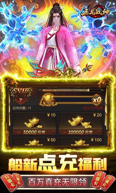《屠龙战神(无限点充买断版)》是一款独创四职业经典挂机!上线送vip15,元宝*1000000,金币*10000万、绝版时装套,豪华资源轻松开局!全新版本解锁新姿势,GM手撸无门槛真点充,手速越快金额越高;开局送白嫖特权,解锁高级特权每日领取大量充值卡和打宝金库!全新买断版本,激活特权即可买断指定系统直升满阶,再也不用担心坑太深!输入BUG指令,每日获得大量真充和升阶资源,GM打宝地图更有神秘宝藏等你来爆!快来邀请你的好游一起来解锁船新的买断版本吧!