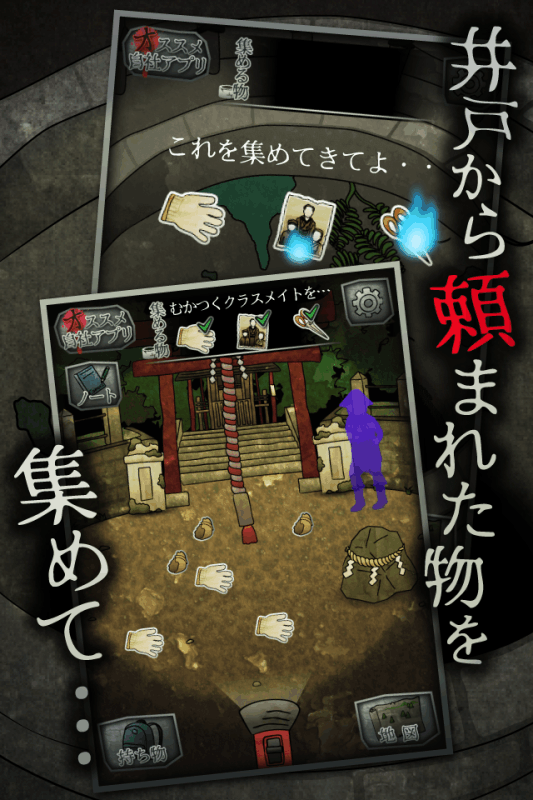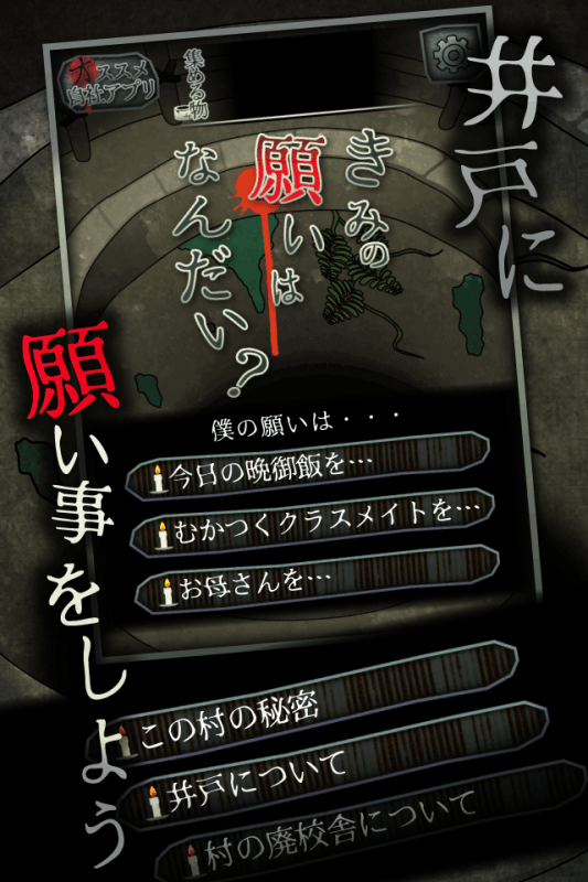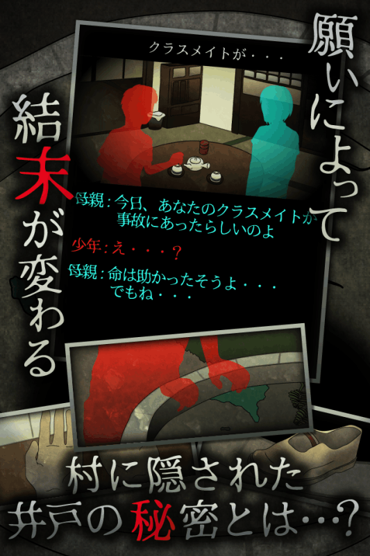 昭和64年8月― 少年はとある村の山奥で、ある不思議な”井戸”を見つけた。 その井戸から楽しそうな声が聞こえた。 「きみの願いはなんだい?」 ―少年と井戸の奇妙な日常が始まる・・・ 無料で楽しめる、夏にピッタリのホラーゲーム。 簡単、育成ゲームで恐怖の怪談話を楽しもう・・・ 【願い事・・・】 少年の願いを何でもかなえてあげると言う井戸。 ただし、願いをかなえる代わりに、 井戸から”指定された物”をもってこなければならない。 村を探索し”指定された物”を集めよう。 【物語】 願い事によって、物語の流れが変わります。 エンディングは3種類。 あなたは”井戸に隠された真実”を見つけることができますか・・・? 【怪奇現象】 ゲーム中に怪奇現象が発生します。 いつ、どこで、何が起こるかはわかりません・・・。 ゲーム内以外で発生した怪奇現象に関しましては、 一切責任を負いませんのでご了承ください。 夏休みのお供に、ホラー育成ゲームで肝の冷やしてみませんか? マンガ好きミステリー好きに、じわじわ迫る恐怖をお届けします・・・。 ホラーゲームや心霊、都市伝説や怖い話、階段、肝試し等のホラーが好きな人にお勧めです! 是非遊んでください! ・ゲームを進めるのに必要なアイテム数を大幅減らしました。 ※約1時間でエンディングまで辿り着けます。 ・怪奇現象の発生条件のヒント機能を追加しました。