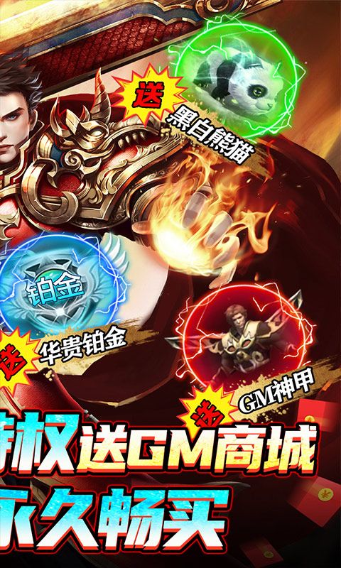 ★上线送满级VIP、华贵铂金、500W绑定蓝钻、限定称号、灵宠-黑白熊猫、GM神甲、GM圣剑、限时王者特权卡、生肖礼盒*12