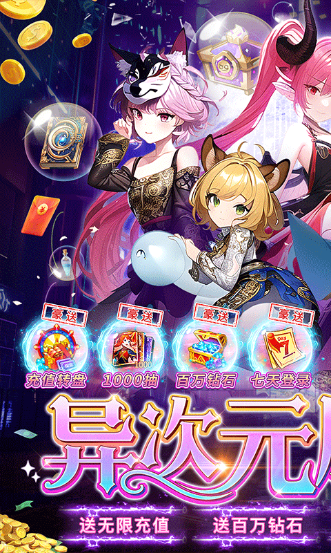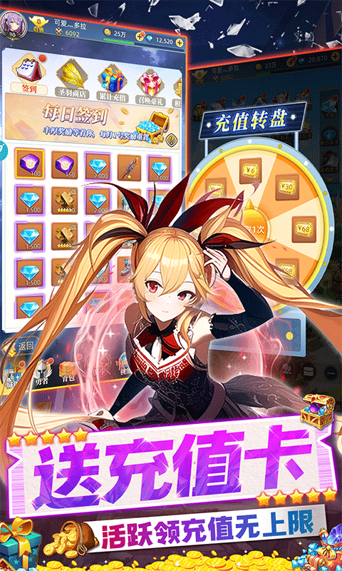 ★后缀说明:每天登录活跃可获得充值转盘卷无限抽充值卡,使用充值卡可获得钻石并激活累充活动,送千抽可抽取各种萌萌的萝莉!御姐!百万钻石活动送100W钻石。