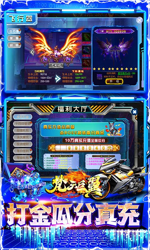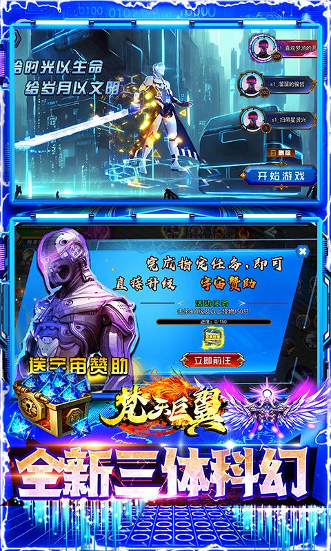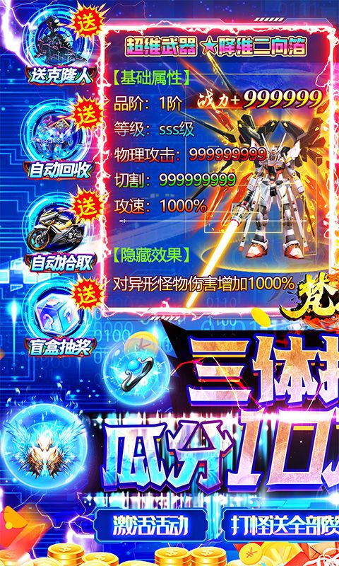 《梵天巨翼(三体全民打金)》独家三体科幻传奇,超爽无暗坑!所有装备高爆率体验!所有高阶装备可以依靠合成进阶!超级全民打金瓜分10万真实充值,自动回收、自动拾取无需充值全部可打!更有全新混沌至尊活动,打怪再送全部赞助,惊喜盲盒抽奖,有概率抽出【开天】神兵,上线送顶级超维武器思想钢印、纳米飞刃、降维二向箔,独家克隆人系统,助力称霸宇宙!