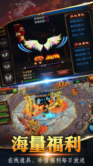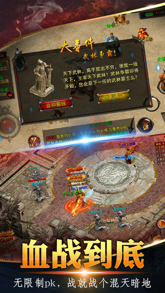 传承经典玩法同时,全面提升PK体验!99%的场景开放无限制PK!更有阵营战、武林争霸、皇城争霸等热血PVP玩法每天开放!特有滑动锁定目的功能,让你不错放每一个跟你抢怪的敌人,更能让你在混战中抢杀BOSS,夺得神装!硬派PK,战,就要战个昏天暗地!