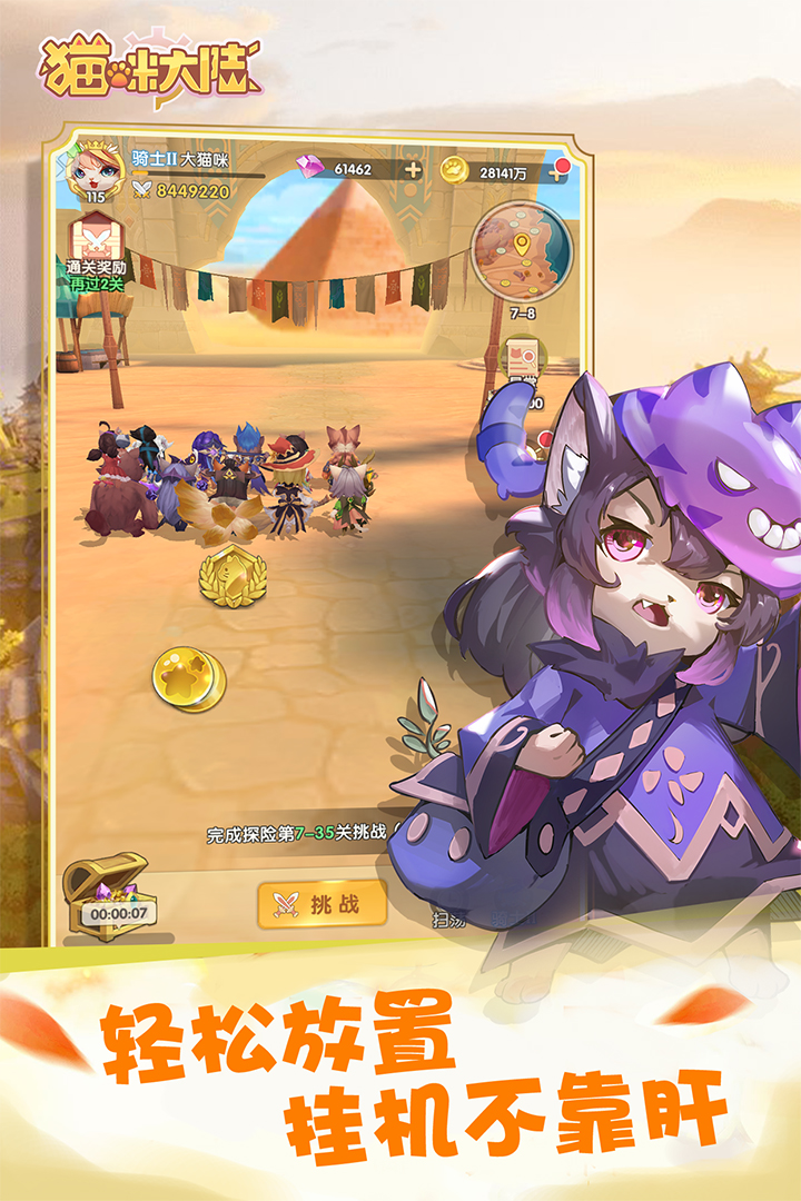《猫咪大陆》是一款萌系猫咪题材的策略放置手游,讲述了祥和的喵界遭到食梦魔入侵,玩家被选为喵界守护者来到喵界带领可爱的小猫咪们对抗食梦魔维护喵界和平的故事。区别于其他游戏,《猫咪大陆》的画面采用了萌系3D的独特风格,让人耳目一新!玩法上颠覆传统放置,让策略玩法与不肝融入了游戏,大量的资源产出以及趣味玩法让玩家轻松畅玩;除此之外,游戏还有超强福利的游戏生态,快来一起撸