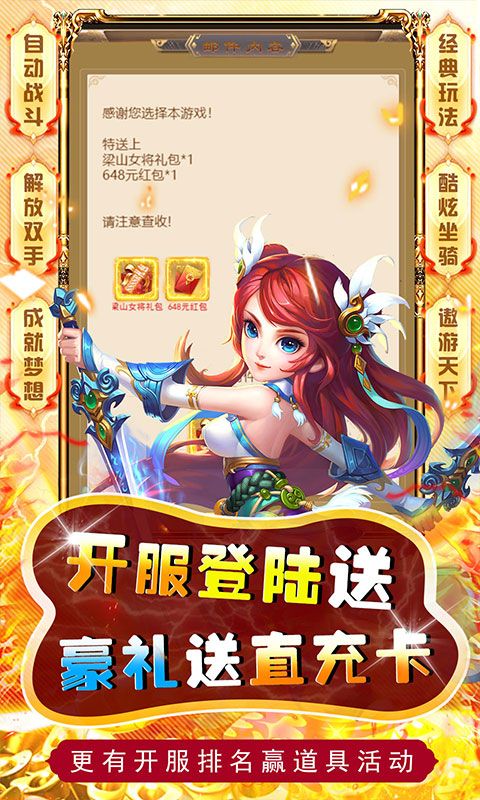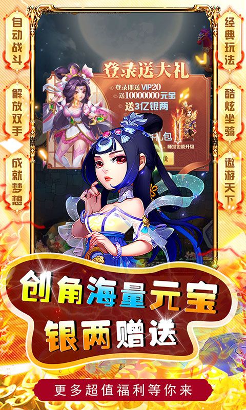 ★上线福利:VIP20、188888金条、1000w元宝、3亿银两、648元红包*1、梁山女将礼包*1、入云龙公孙胜*1(福利大厅每日领取)