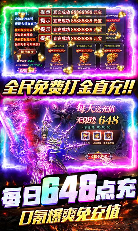 ★后缀说明:游戏内置打金直冲系统,可以通过击杀BOSS获得直冲额度进行充值,购买礼包等。每天还可点充多个648,可激活永久单日、累充活动。