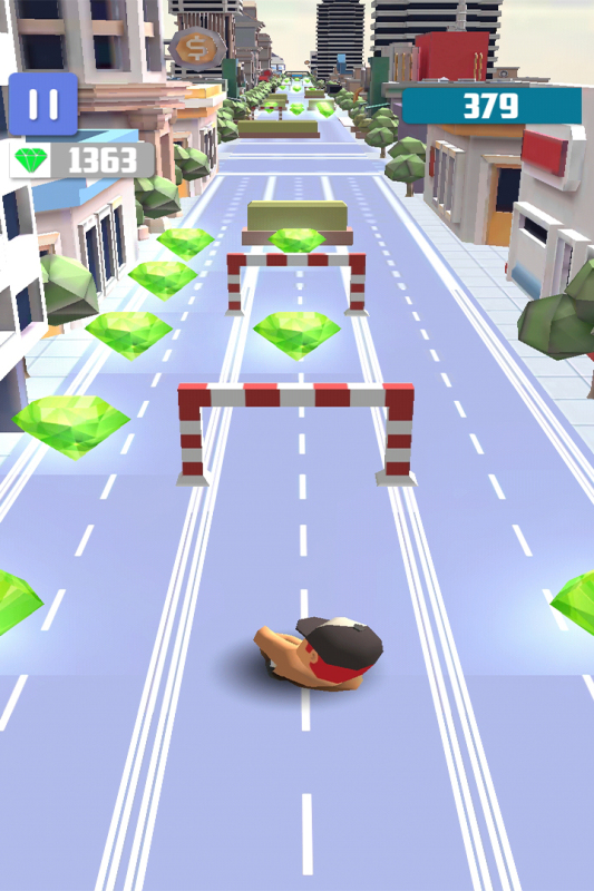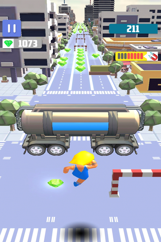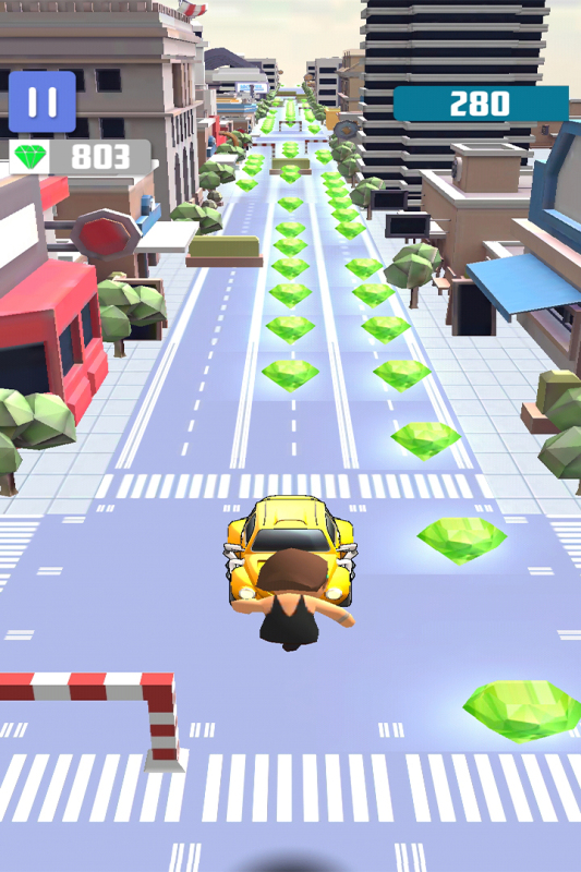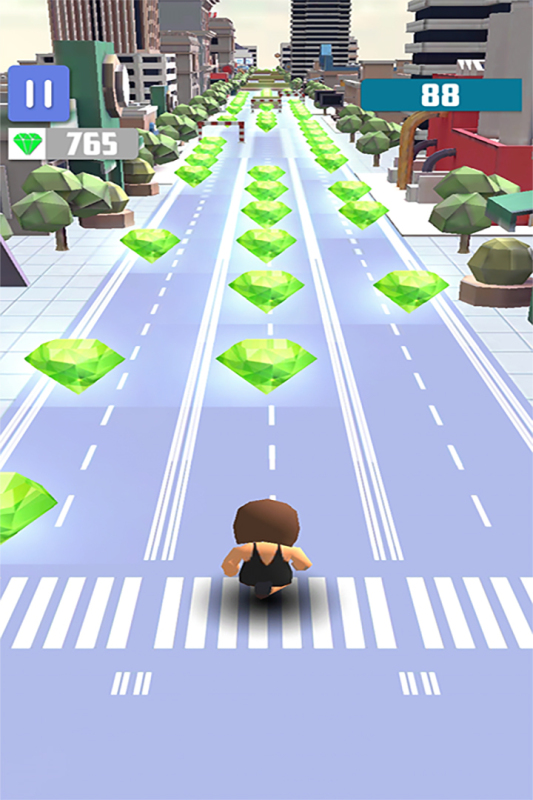 在城市奔跑、跳跃并前进吧!无尽的街道上散落着丰厚的宝藏,奔跑并收集这些宝石来赚取更多的积分。危险的道路上车水马龙,散落着很多的障碍物,跳跃滑行来躲避它们。凶恶的野狗正在后面追逐着你,不要回头,也不要停下奔跑,勇往直前,笔直前进。